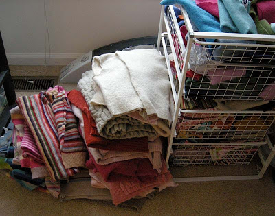 I also have piles, but not as organized as Betz’s. Color piles, good idea. I really need a bigger room, knock aout a wall or something. Hmm, Oh Honey?
