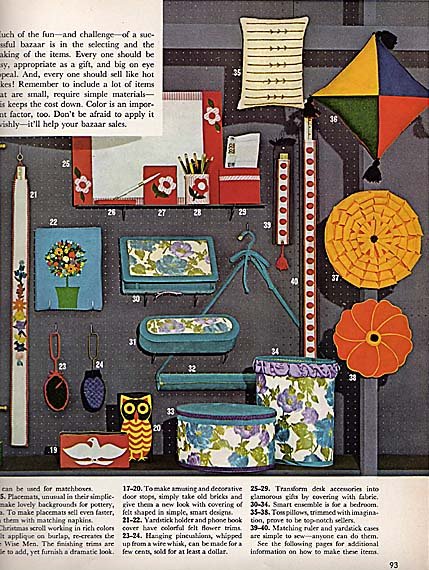Oh and how ’bout on this page…there is quite an array of yardstick covers. Better yet, see the owl and eagle at the bottom? “To make amusing and decorative door stops, simply take old bricks and give them a new look with a covering of felt in simple, smart designs.” And my favorite, right above the bricks: “Hanging pincushions, whipped up from a wire wisk, can be made for a few cents, sold for at least a dollar.”! I’ll have to keep that in mind for the next Pincushion Challenge.