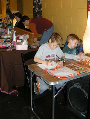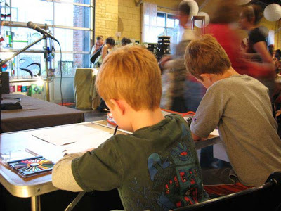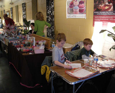 The venue, Plant Zero, is in a very cool industrial type area and it was a really great space for a show like this. (*had a camera flash problem with this shot, but you get the idea*) One of my worries for the day was bringing along our two boys. We had planned to bring a sitter/helper but the plan fell through. We totally lucked out that our booth was situated at the end of a row. We set up a little table for the boys to draw at.