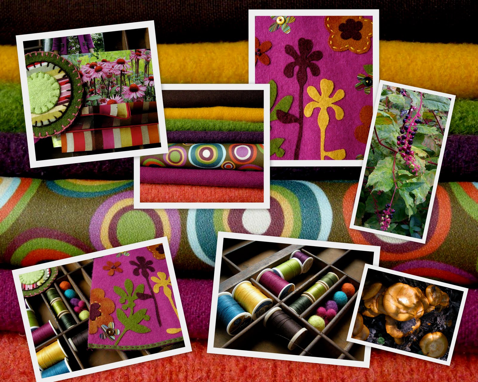 I love color. I am working on my next print collection so I am pulling together all of the yummy fall colors that feel so good to me right now. Plum, magenta, orange, brown, a little tealy-turq…and of course lots of green.